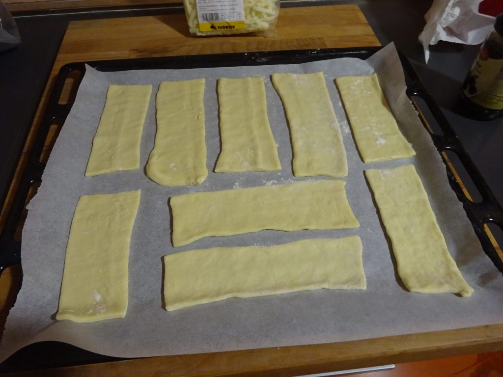 Déroulez la pâte à pizza, découpez 12 bandes et disposez-les ensuite sur des plaques de four recouvertes de papier sulfurisé.