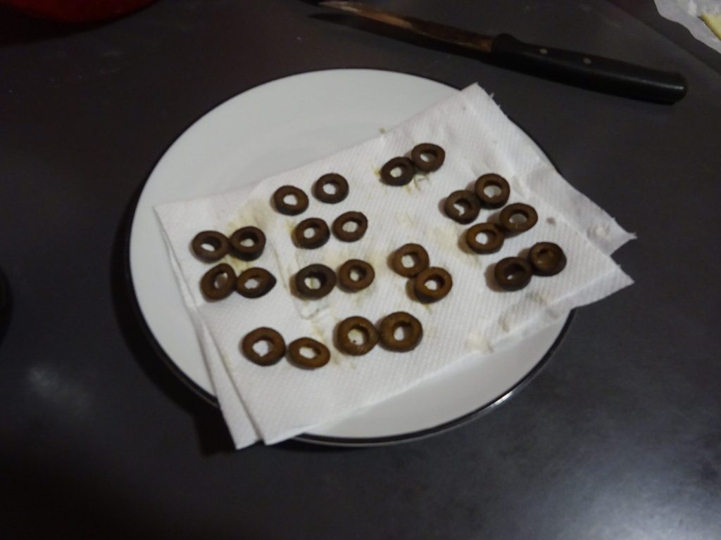 Coupez ensuite les olives en rondelles, elles seront les yeux des momies.
