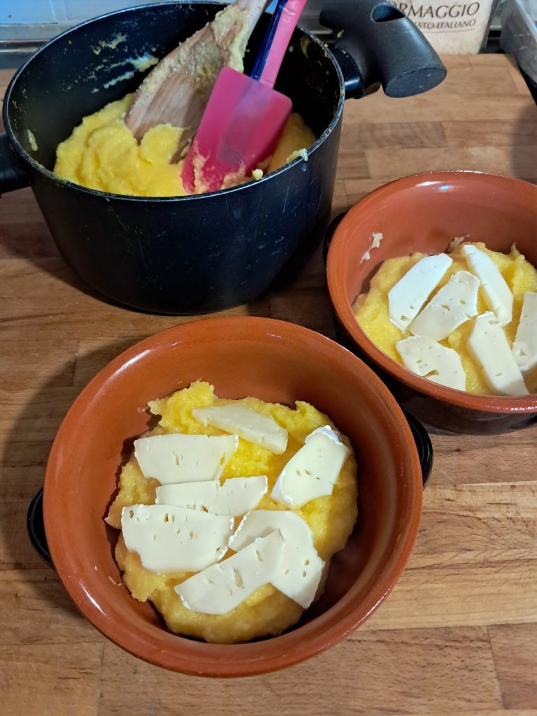 Ajoutez 2/3 cuillères de polenta, nivelez-la grossièrement et ajoutez des tranches de tome.