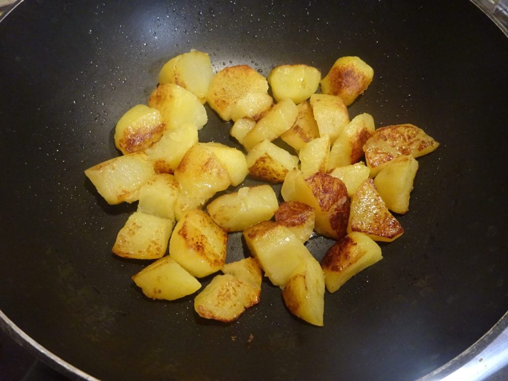 Une fois cuites, laissez tiédir 5 minutes. Transférez-les ensuite dans un wok avec 2 cuillères à soupe d’huile d’olive et faites dorer à feu moyen jusqu’à ce qu’elles soient dorées de tous côtés.