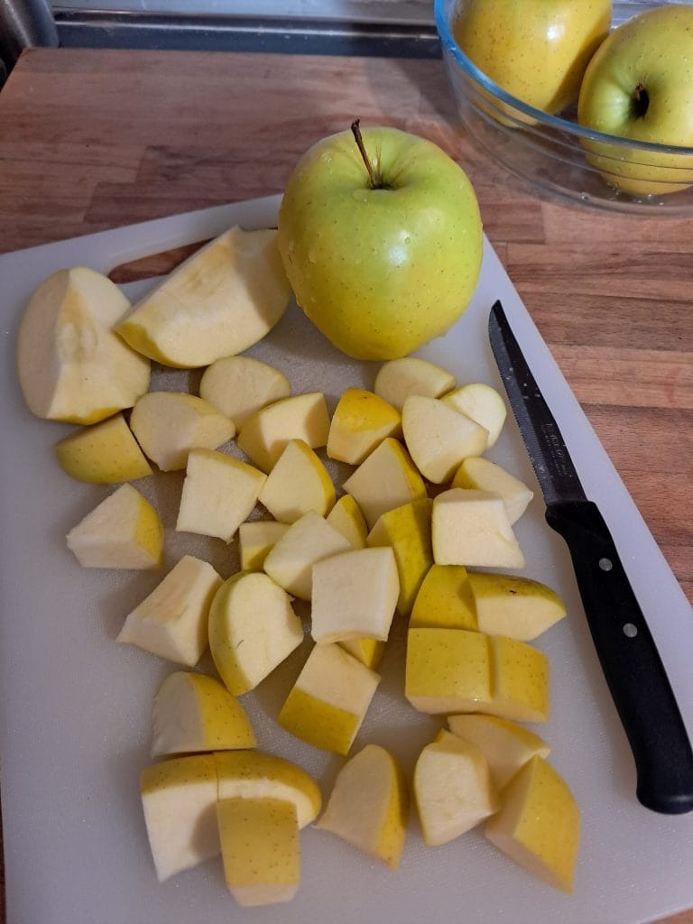 Lavez bien les pommes, sans les sécher, coupez-les en deux, retirez le trognon et coupez-les en morceaux pas trop petits.