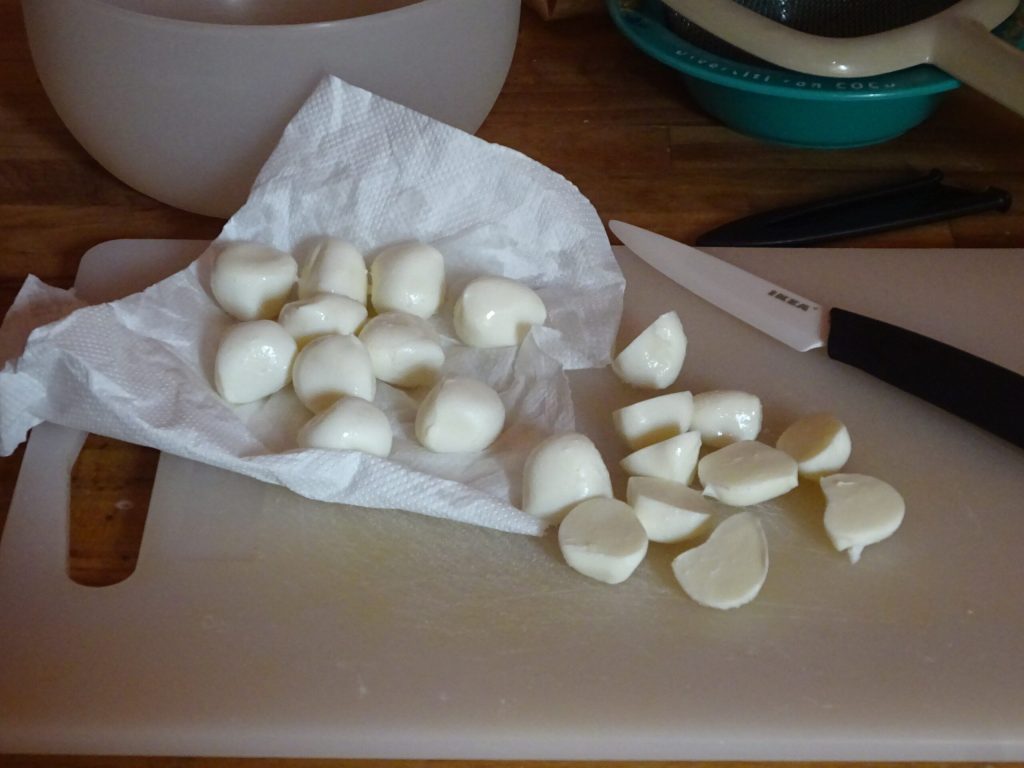 Égouttez bien les billes de mozzarella, puis tamponnez-les avec du papier sulfurisé et enfin coupez-les en deux.