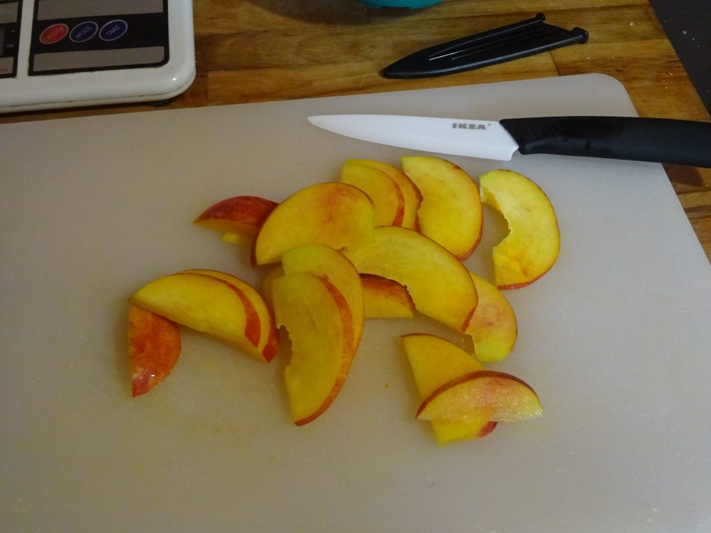 Maintenant, lavez bien les pêches nectarines puis coupez-les en tranches fines, pas plus de demi-centimètre d’épaisseur.