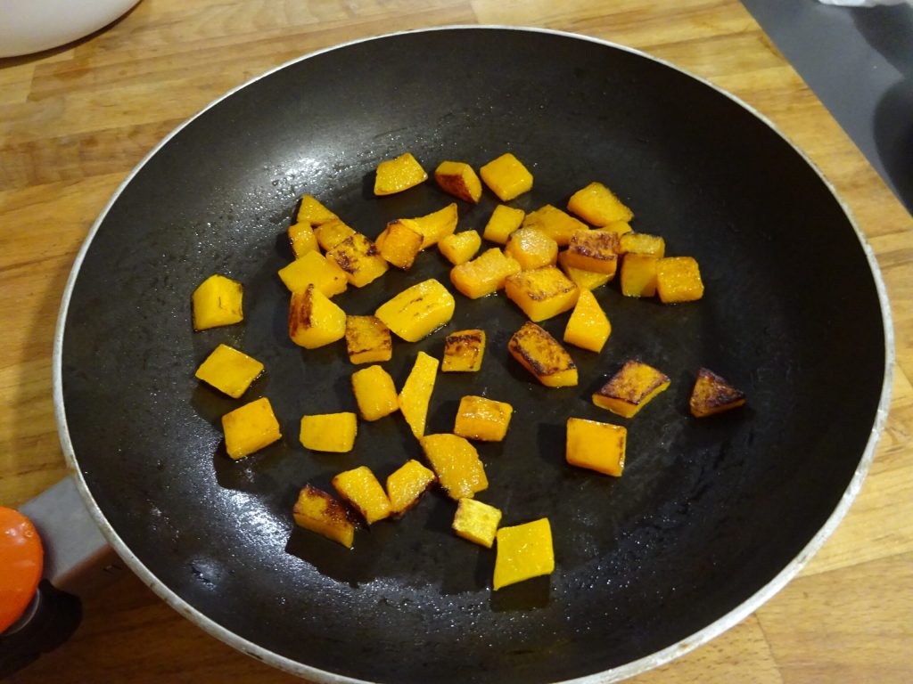 Dans la même poêle où vous avez cuit la courge, faites griller le pain en cubes pendant 4/5 minutes.