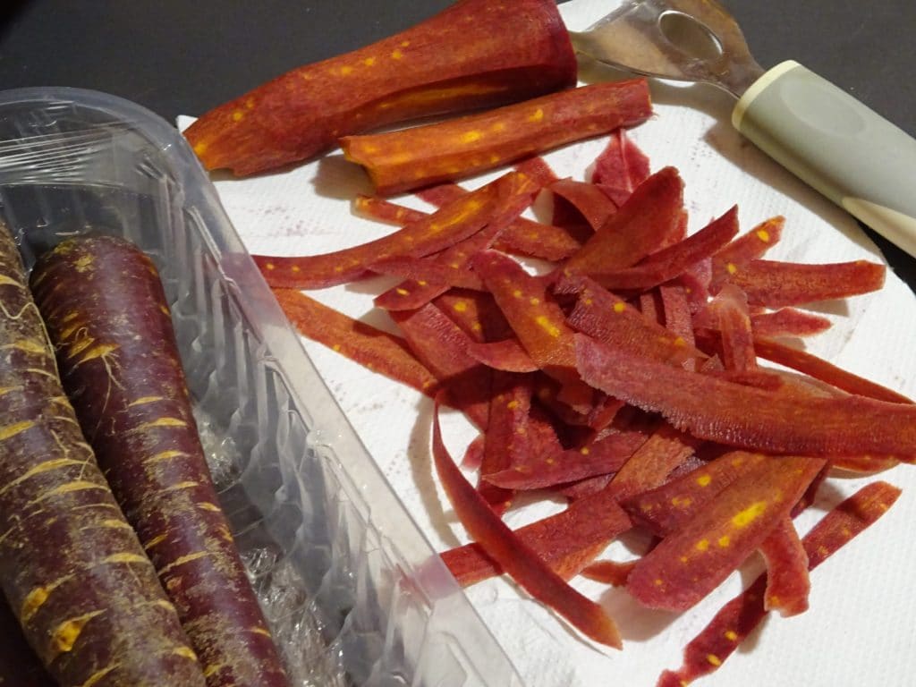• Nettoyez et lavez la carotte violette puis à l’aide d’un éplucheur, faites des lamelles.