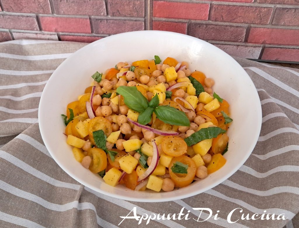 Salade de pois chiches et mangue, une salade légère au goût frais et délicat parfaite pour l’été. Il n’y a pas d’ingrédients à cuire et elle se prépare en 10 minutes chrono, donc idéale aussi pour l’arrivée d’invités de dernière minute.