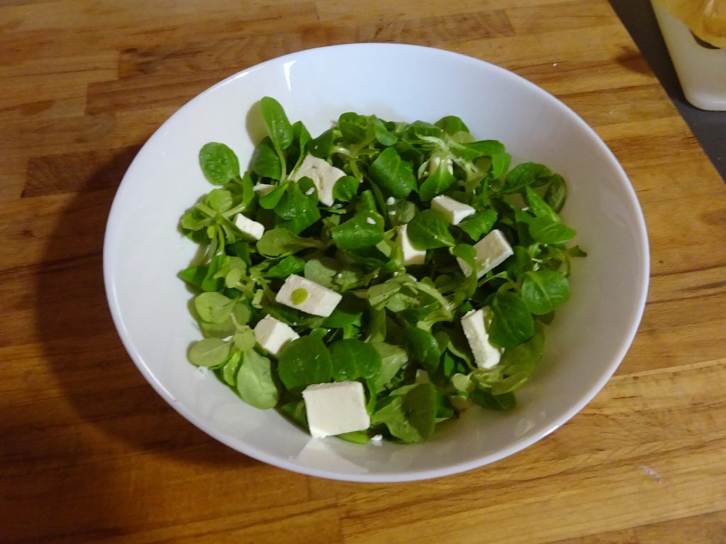 Entre-temps, coupez la feta en cubes et disposez-la avec la mâche dans 2 saladiers.