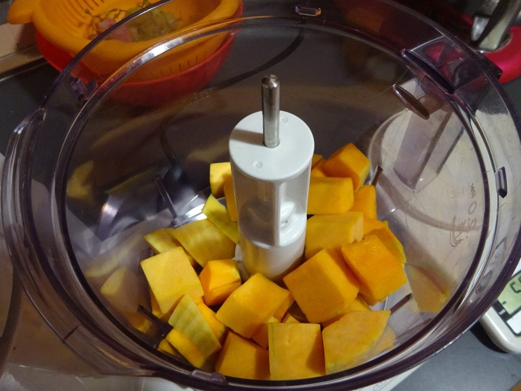• Tout d’abord, retirez la pâte brisée des emballages en plastique et mettez-la de côté. Versez la courge coupée en gros morceaux dans le hachoir et mixez-la jusqu’à obtenir une texture presque poudreuse.
