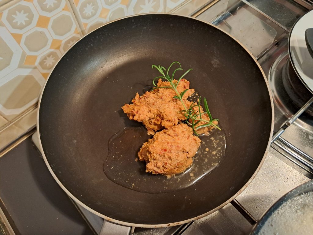 Pendant ce temps, dans une grande poêle, versez le PESTO DE FRUITS SECS (pour la recette, cliquez sur le texte en bleu) ajoutez un brin de romarin et une demi-louche d’eau de cuisson des trofie. Mélangez jusqu’à ce que le pesto devienne bien crémeux.