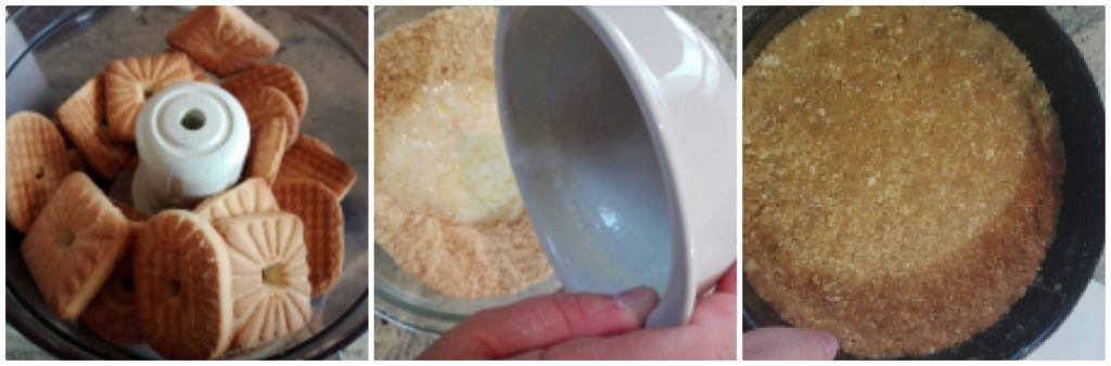 Commencez par mixer finement les biscuits. Faites fondre le beurre au bain‑marie ou au micro‑ondes et incorporez‑le aux biscuits mixés. Mélangez bien jusqu’à obtenir une texture de sable humide (ajoutez une cuillère à soupe de lait si nécessaire). Tapissez le fond d’un moule à charnière de 24 cm avec du papier cuisson, versez le mélange et tassez bien avec le dos d’une cuillère. Laissez reposer au réfrigérateur pendant au moins 30 minutes.