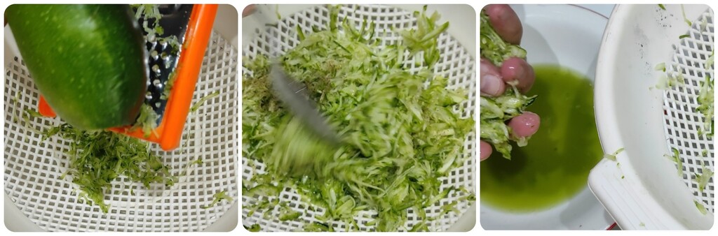 Râpez directement les courgettes dans une passoire en plaçant une assiette dessous pour recueillir le liquide qu’elles rendent.
