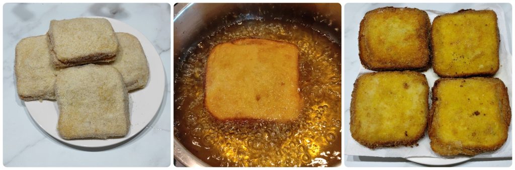Enfin, passez-le dans la chapelure, en essayant de bien le couvrir pour éviter que le fromage ne s’échappe pendant la cuisson.