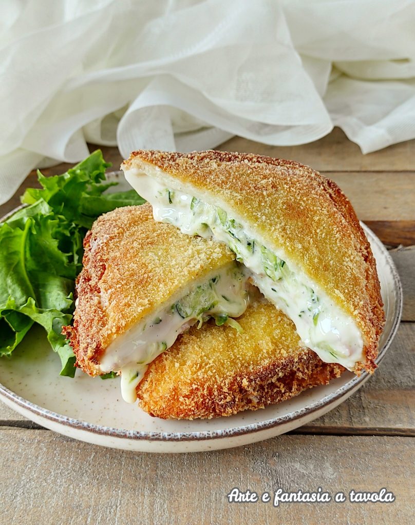 Le Pain et courgettes en carrozza sont de simples sandwiches de pain garnis, puis frits dans beaucoup d’huile. Une recette qui enveloppe le pain de mie d’autres ingrédients, comme de délicieuses courgettes râpées, du jambon cuit et des tranches de fromage fondu, mais vous pouvez remplacer à votre guise par du fromage qui fond bien ou un autre charcutier. Un apéritif ou plat complet très facile à réaliser, une vraie gourmandise.
