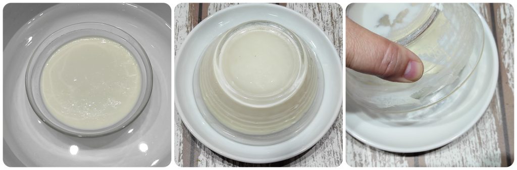 Portionnage et repos : Filtrez le mélange à travers une passoire fine (optionnel, pour une soyeuseté supplémentaire) et versez-le dans des coupelles de 130 ml. Laissez refroidir à température ambiante.