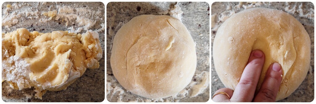 Maintenant, versez cette pâte obtenue sur un plan de travail légèrement fariné et formez un pâton à la main. Pas besoin de trop la travailler, il suffit de la compacter.