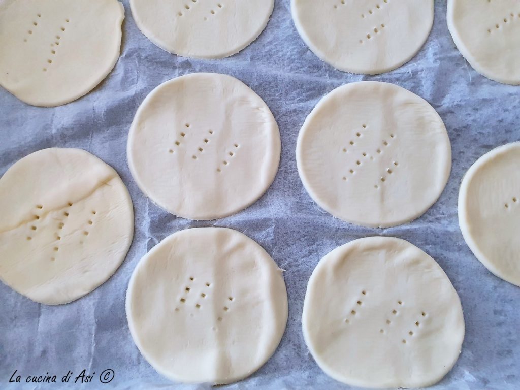 1) Tout simplement, je préchauffe le four à 190°C et je trace avec un verre ou un emporte-pièce plusieurs cercles, et avec un paquet, j’ai fait (en réutilisant la pâte restante) environ 12 petits feuilletés ronds !