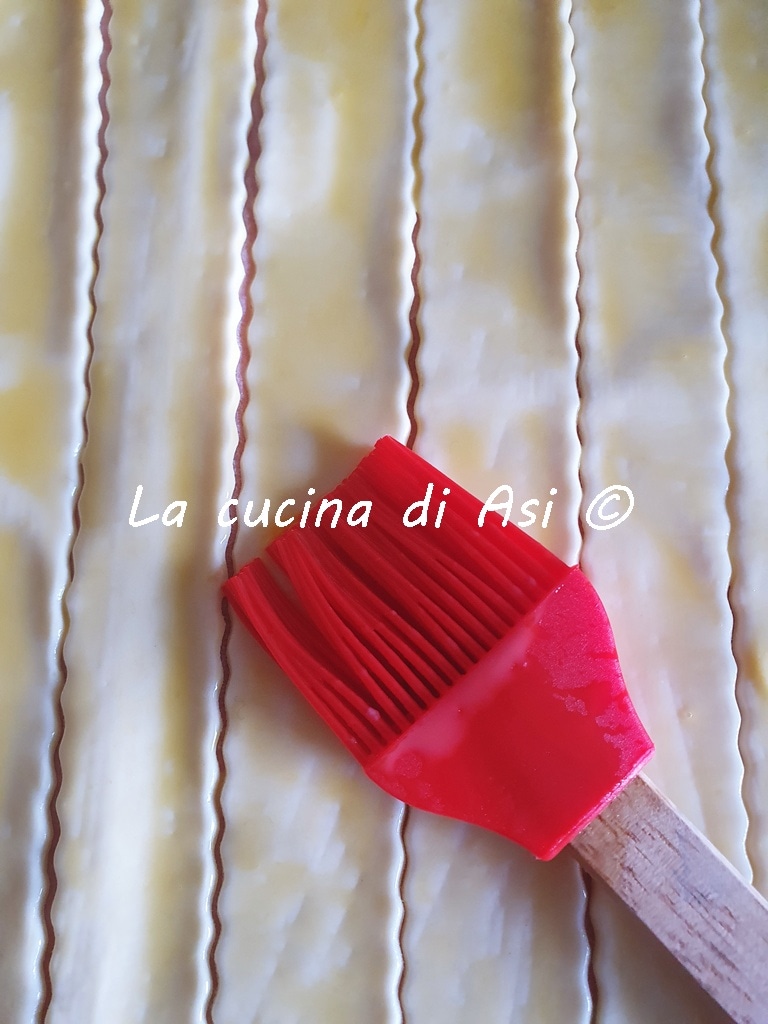 Dans un verre ou un petit bol, je mélange le jaune d’œuf avec une cuillère à soupe d’eau et avec un pinceau de cuisine je recouvre toutes les bandes de pâte feuilletée.