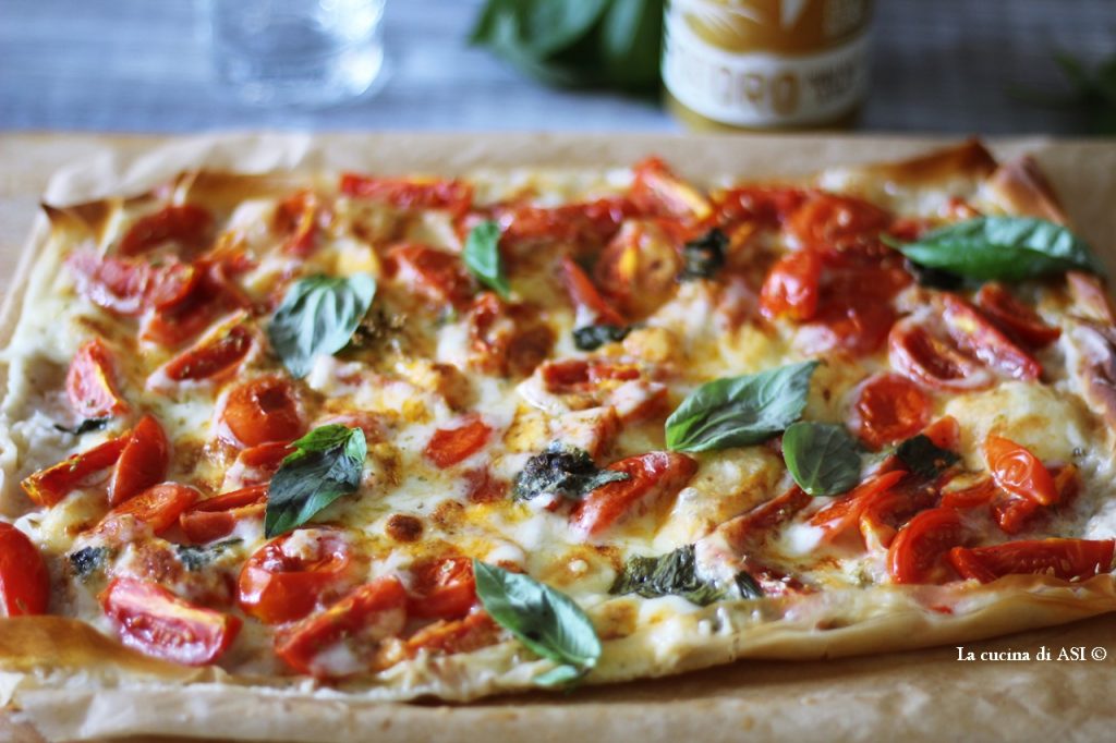 Bien sûr, l’appeler pizza est un mensonge si nous l’entendons dans le sens classique et précis d’un produit moelleux et levé pendant des heures, mais en fin de compte, cette pâte en plusieurs couches est tendre, agréable et garnie de mozzarella, de tomates cerises et d’un tas de basilic, ça devient une bonne tarte salée, une entrée ou un goûter salé, fondant et très facile à faire!