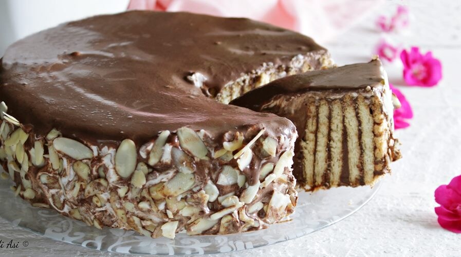 La recette de gâteau rapide sans cuisson au four est simple parce qu’après avoir fait une crème au chocolat sans farine, il suffira de garnir et disposer les biscuits secs oswego ou similaires en cercle (mais un moule rectangulaire ou carré convient aussi) et continuer jusqu’à couvrir toute la surface du moule utilisé.