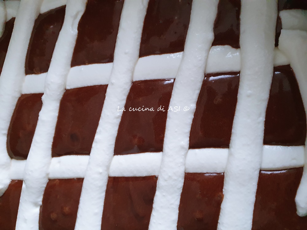 7) Je nivelle maintenant bien le mélange bicolore moelleux et je commence à tracer les lignes du gâteau duvet bicolore ultra moelleux et j’enfourne à 170°C en cuisson statique pendant environ 40 minutes mais comme toujours attention à la cuisson car chaque four a sûrement sa propre vie!