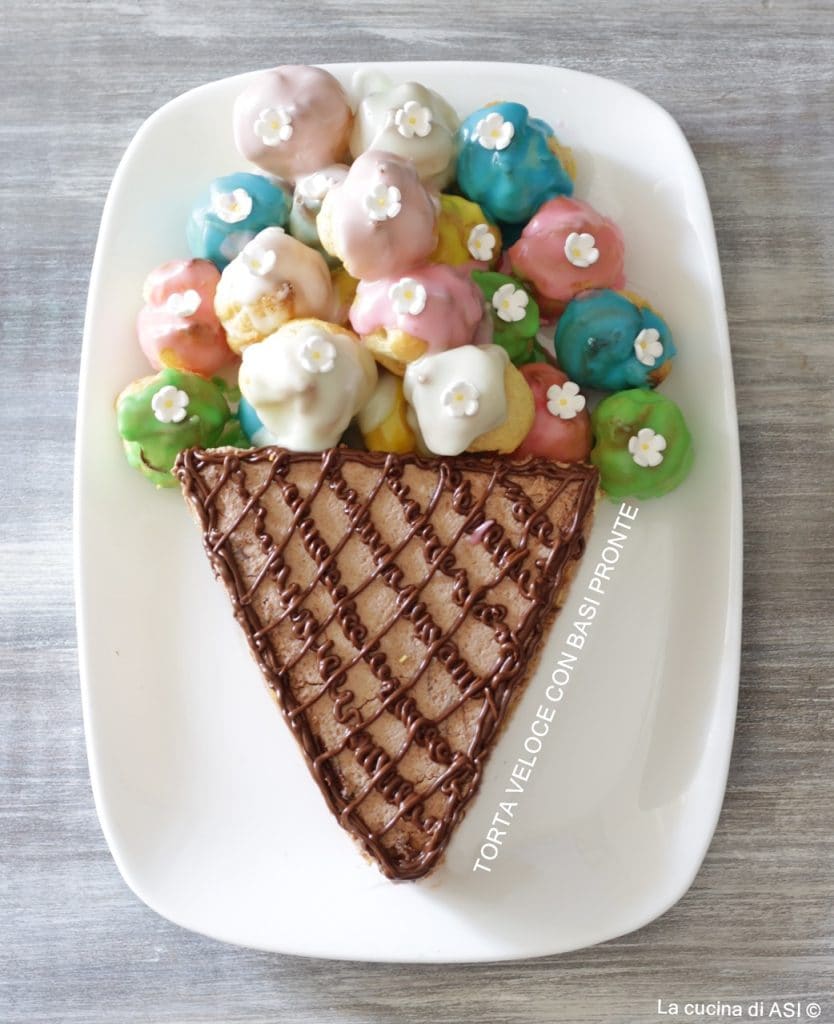 Je garnis ou non, mais je recouvre le cône de glace avec la crème, ensuite, après avoir garni les choux avec la chantilly (ou ce que je préfère), je les glace à volonté et je les place comme des boules de glace sur le cône de génoise.