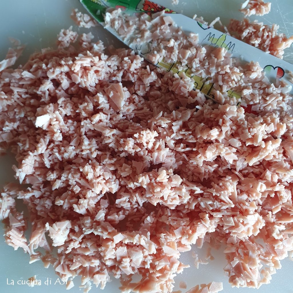 Je hache très finement la mortadelle que j’ajoute ensuite aux pommes de terre cuites et passées au presse-purée.