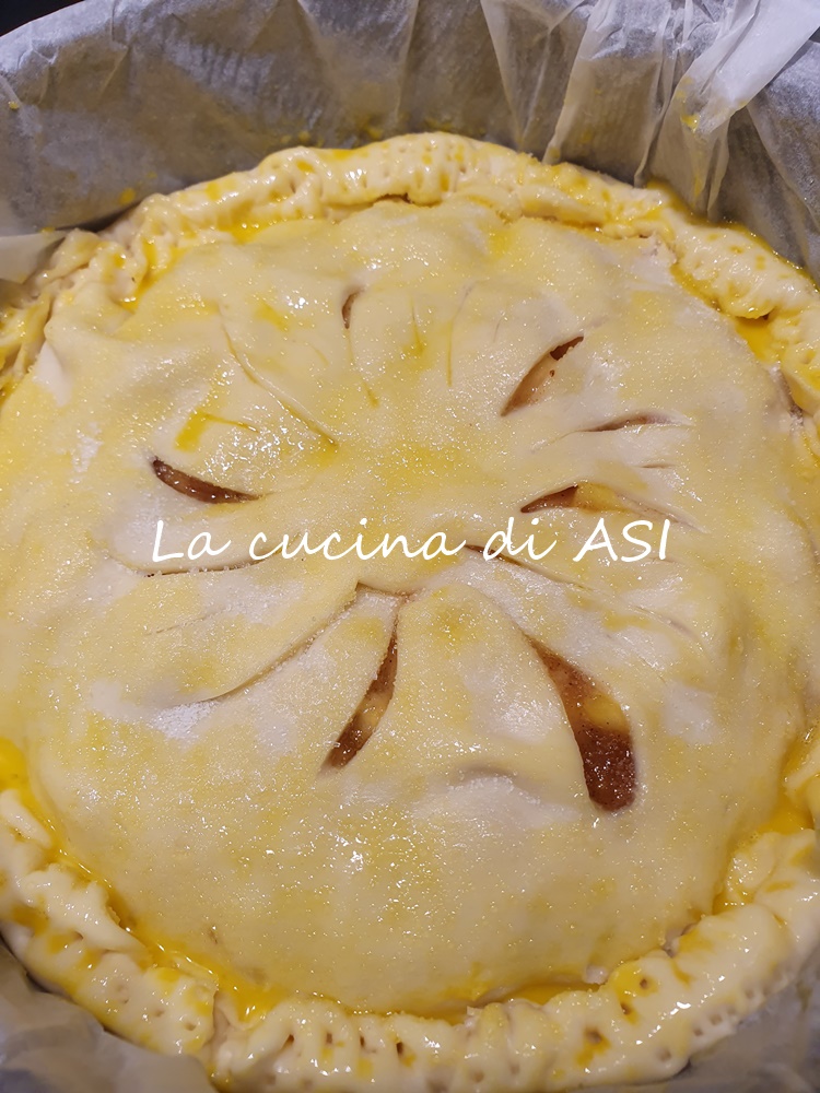 Je verse ensuite les pommes avec tous les autres ingrédients, je les égalise et recouvre avec la deuxième pâte brisée, en repliant les bords extérieurs, puis en éliminant l’excès de pâte et en scellant bien la tarte aux pommes américaine.