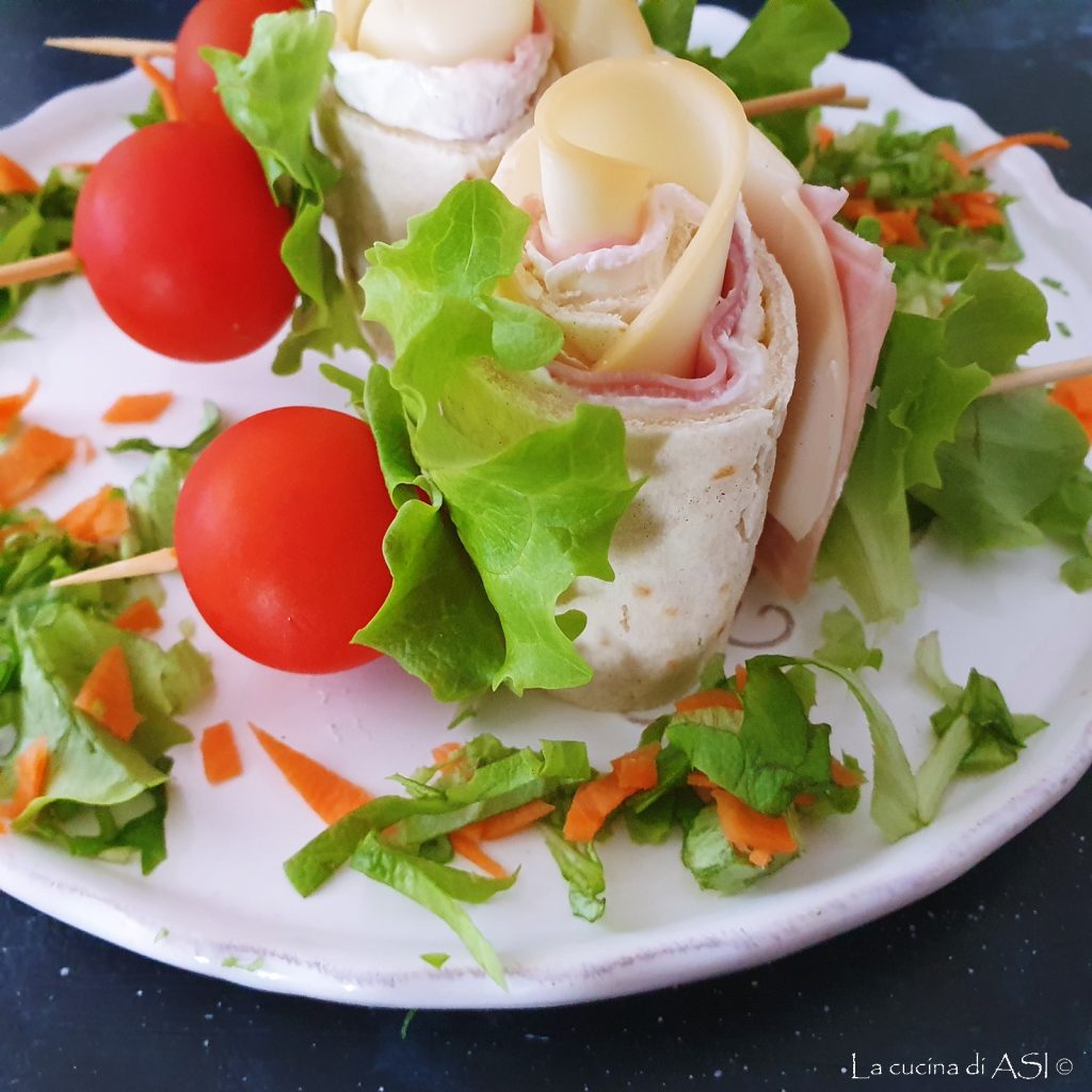 Chaque fois que je vois des recettes similaires, je pense oui au goût des ingrédients mais aussi à la praticité de les manger parce que parfois ce sont de belles propositions mais ensuite la sauce coule sur toi et tu te salis les mains ce qui est vraiment gênant donc…. Pour ces brochettes fleuries à la piadina, bien qu’on puisse les manger en petites bouchées, peut-être vaut-il mieux les retirer de la brochette et les manger comme finger food : je vous assure que rien ne coule et on ne se salit pas du tout!