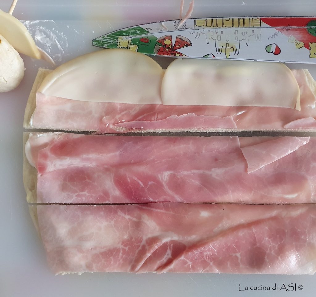 J’ai utilisé du fromage à tartiner mais on peut utiliser de la robiola et du mascarpone, j’ai ensuite superposé les tranches de jambon cuit que l’on peut remplacer par des tranches de speck fines et plus savoureuses et enfin j’ai ajouté, les laissant dépasser un peu, des tranches de scamorza mais on peut opter pour des tranches fines de provola ou mozzarella très fine.