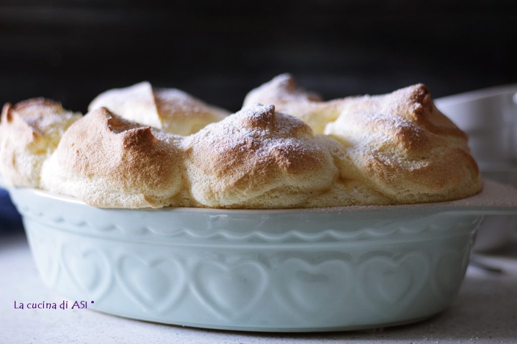 J’ai déjà préchauffé le four statique à 210°C et j’enfourne le soufflé meringué de Salzbourg en le faisant cuire à 180°C pendant 10 minutes, puis en baissant la température du four à 170°C pour poursuivre la cuisson pendant encore 8/9 minutes.