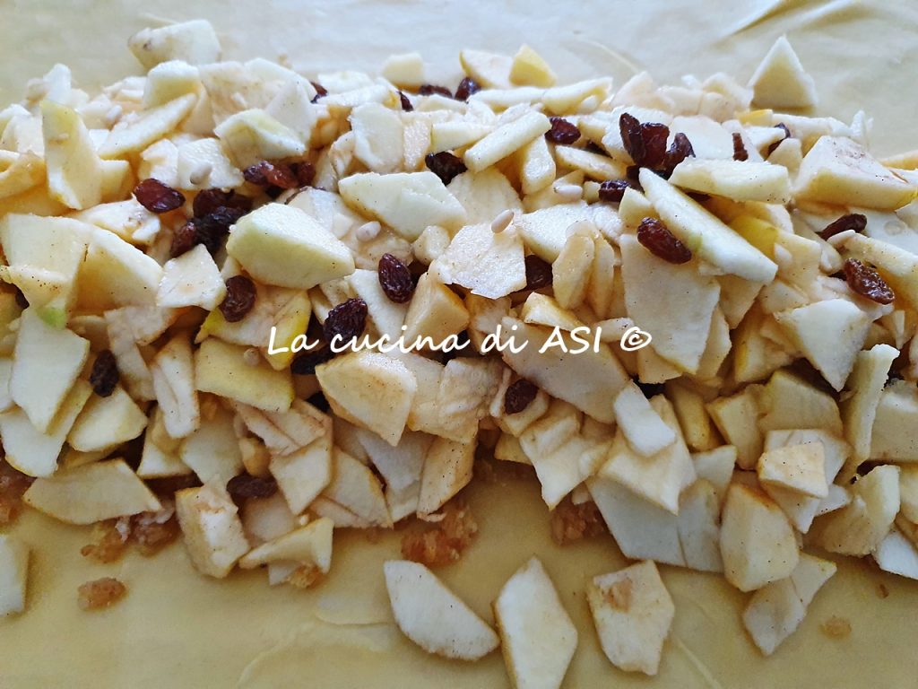 C’est le classique strudel aux pommes mais il serait intéressant, en utilisant la même pâte au goût neutre, de mettre comme garniture la ricotta avec des raisins secs ou seulement des fruits comme les poires et les prunes !