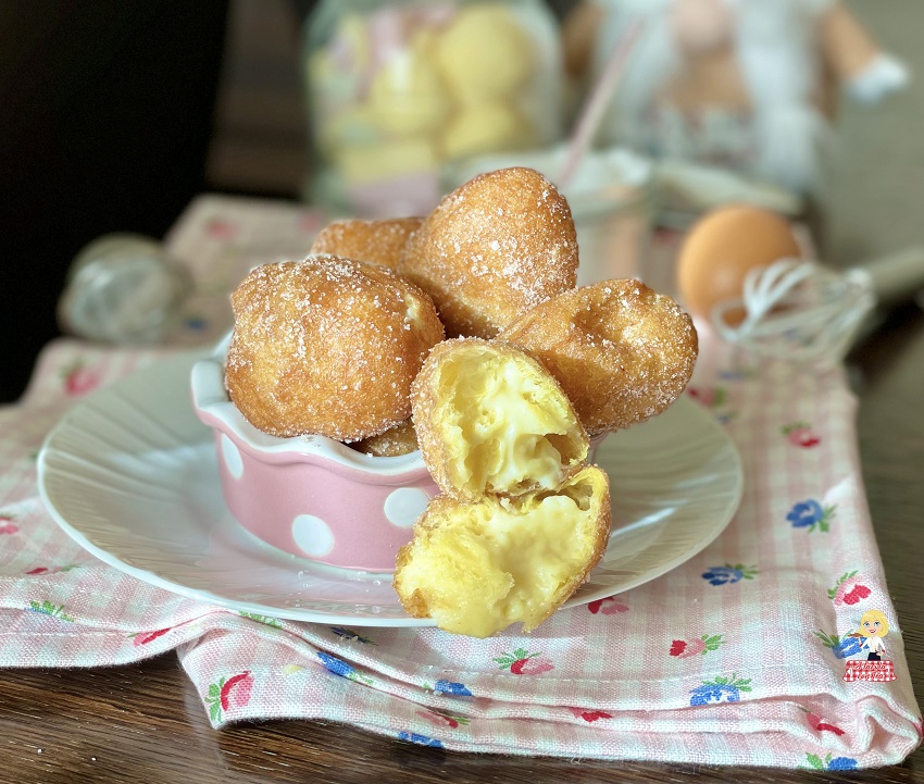 Les beignets de riz sucrés sont délicieux également nature, sans garniture, mais avec la crème pâtissière ils sont encore meilleurs. Je vous laisse le choix.