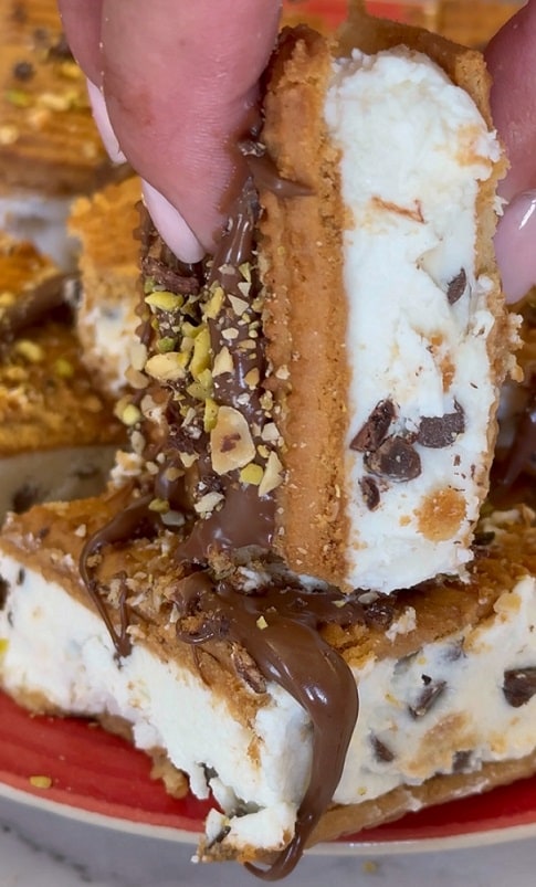 Une fois que la glace est complètement durcie, extrayez le bloc du moule en tirant doucement sur le papier cuisson. Transférez-le sur une planche à découper et, en suivant les lignes des biscuits sous-jacents, coupez le bloc en glaces biscuit individuelles.