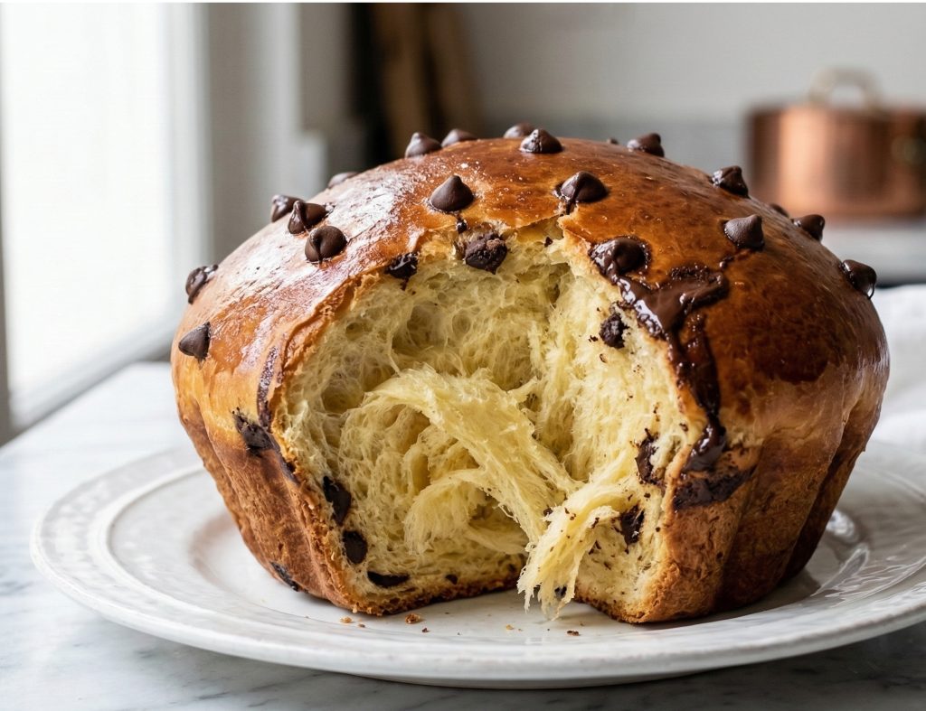Étire délicatement la pâte levée et répartis les pépites de chocolat noir. Rabats la pâte sur elle-même plusieurs fois pour bien les incorporer. Divise en deux pâtons, façonne-les en boules (pirlatura) et laisse-les lever encore 2-3 heures jusqu’à ce qu’ils doublent de volume.