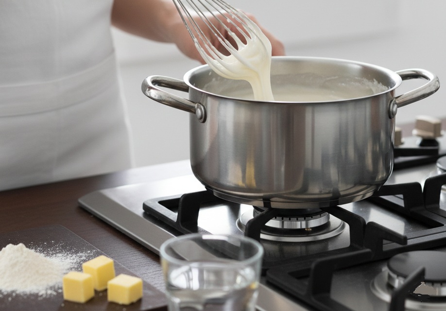 Dans une petite casserole, mélange la farine avec l’eau. Mets sur feu moyen pendant 2-3 minutes en remuant continuellement jusqu’à ce que le mélange épaississe et prenne une consistance gélatineuse. Retire du feu et laisse refroidir complètement avant de l’utiliser.