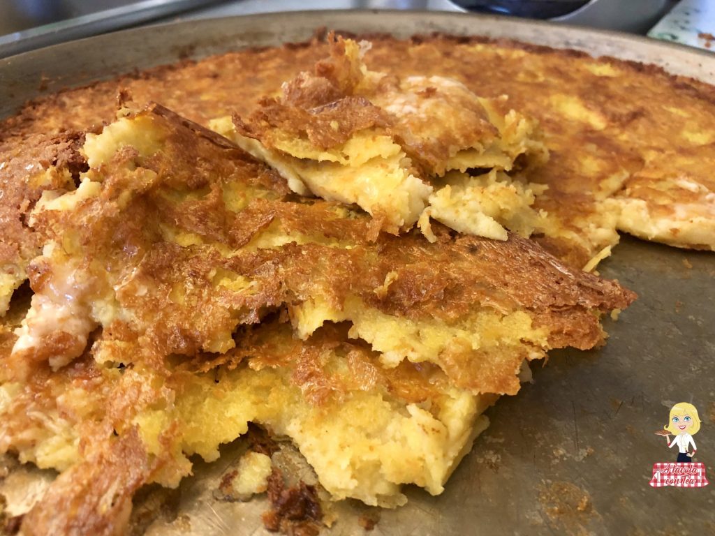 Deuxièmement, il est important de choisir le bon moule – idéalement en cuivre – mais si vous ne l’avez pas, l’important est de choisir un moule antiadhésif et de bien le graisser pour éviter que la farinata ne colle au fond.