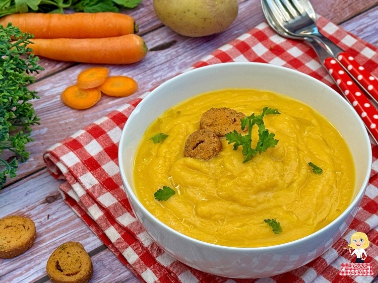 VARIANTES: Si vous aimez les goûts plus riches et savoureux, vous pouvez faire revenir les pommes de terre et les carottes à la poêle avec de l’huile et de l’oignon puis ajouter quelques cubes de lard ou de pancetta. Ou vous pouvez simplement le rendre plus aromatique en ajoutant simplement de la muscade ou du gingembre râpé juste avant de le servir. Enfin, si vous souhaitez transformer votre velouté de carottes en un plat complet, vous pouvez une fois le velouté préparé, ajouter du bouillon pour y cuire du riz, des pâtes ou des céréales.