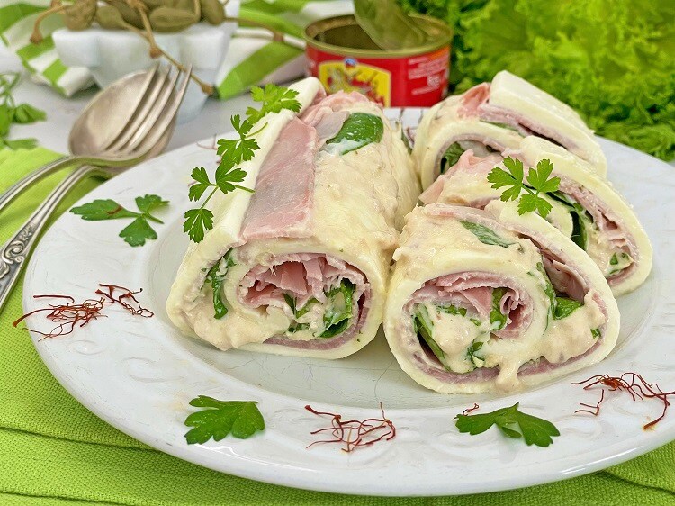 Entre-temps, lave la laitue et sèche-la avec un chiffon propre. Prends une planche à découper, couvre-la d’une feuille de papier sulfurisé et dispose dessus le feuilleté de mozzarella déroulé. Commence à composer la farce en faisant une première couche avec le jambon cuit, puis étale sur le jambon une couche de Sauce Tonnata, continue en déposant sur la sauce les feuilles de laitue et termine par une dernière couche de jambon cuit.