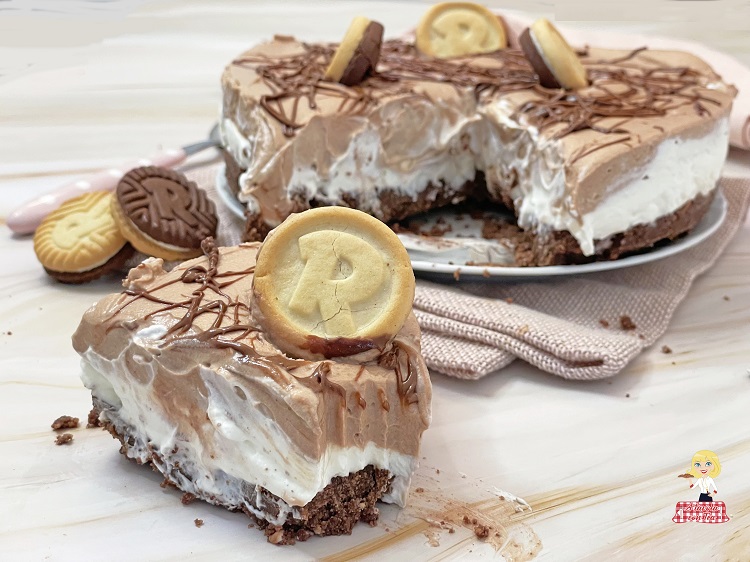 Aujourd’hui, c’est un gâteau bistrate, une couche blanche et une couche chocolatée pour rappeler les biscuits Ringo de la base, mais rien ne vous empêche de le garnir d’un seul goût.