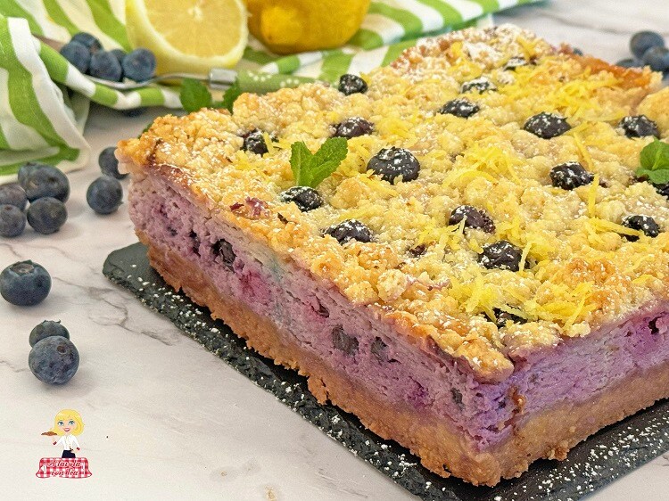 La base de ce dessert et la couche supérieure sont constituées d’une pâte spéciale « en miettes » et elle est croquante à la morsure tandis que la couche intérieure est une garniture crémeuse au goût qui rappelle vaguement celui du Cheesecake. J’ai choisi de la préparer avec des myrtilles car j’aime le contraste sucré-acidulé de ce fruit et aussi pour sa couleur qui rend ce dessert également agréable à regarder.