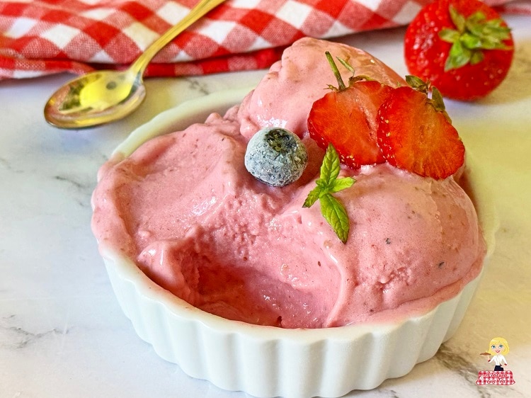 Dans la recette d’aujourd’hui, j’ai préparé la GLACE À LA FRAISE mais avec la même recette, vous pouvez créer toutes les glaces aux fruits que vous voulez (vous trouverez dans les Notes en bas de la recette des suggestions pour d’autres saveurs même mixtes) comme myrtilles et mûres, banane et mangue, pêche et abricot, et ainsi de suite.
