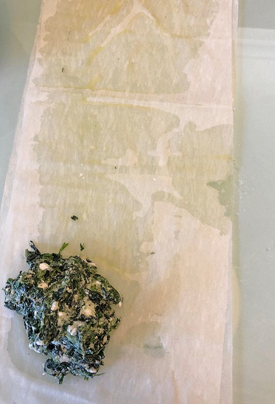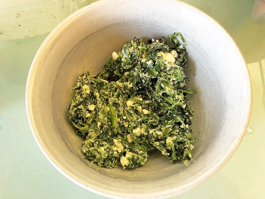 Laissez refroidir les épinards dans un saladier, ajoutez la feta émiettée et une pincée de poivre noir. Il ne devrait pas être nécessaire d’ajouter du sel car le fromage feta est déjà assez salé ; goûtez quand même pour vérifier. Mélangez bien pour que les ingrédients s’amalgament.