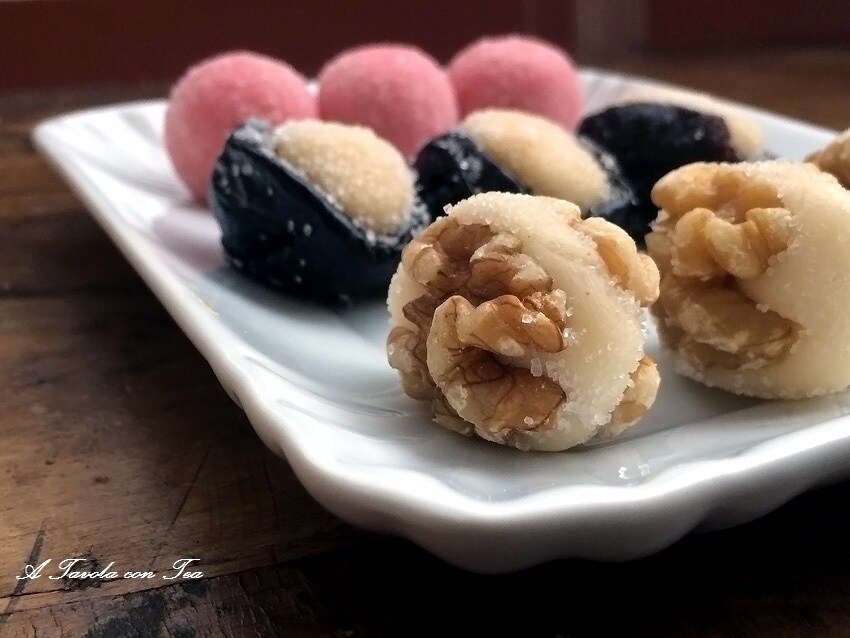 • Pour composer les petits gâteaux de PÂTE D’AMANDES, créez des petits cylindres avec la pâte de Massepain si vous souhaitez « farcir » des pruneaux secs et/ou des dattes (évidemment préalablement dénoyautés et coupés en deux dans le sens de la longueur) puis mettez la pâte à la place du noyau. Et une fois prêts, passez la partie avec le Massepain à vue dans une assiette avec du sucre semoule.