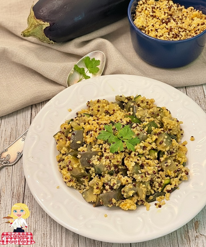 Aujourd’hui nous cuisinerons ensemble la recette de l’insalata de QUINOA aux légumes, un plat sain et savoureux réalisé avec des aubergines, qui en cette période de l’année sont à leur meilleur. J’ai choisi ce légume parce que je l’avais déjà au frigo, mais vous pouvez tout à fait utiliser d’autres légumes frais comme des courgettes, des poivrons ou des tomates selon vos goûts.
