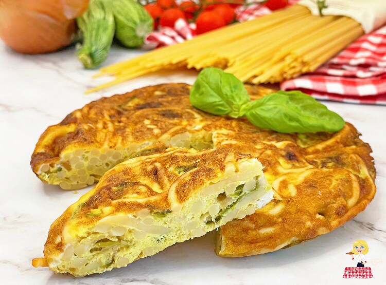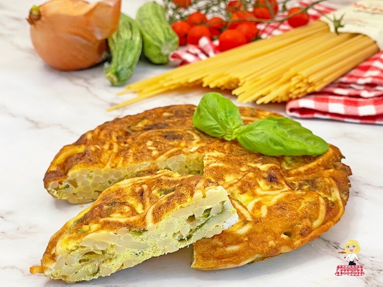 L’Omelette de Pâtes, excellente aussi bien chaude que froide, est parfaite comme sauve-dîner à servir comme plat unique ou à emporter au bureau, à la mer ou au pique-nique et coupée en morceaux comme finger food lors d’un apéritif dinatoire.