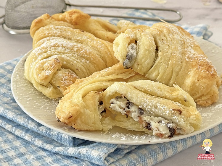 Elles rappellent par la forme les sfogliatelle napolitaines classiques mais se réalisent avec de la pâte feuilletée déjà prête : croustillantes à l’extérieur, moelleuses à l’intérieur et très crémeuses — enfin une recette à la portée de tous.