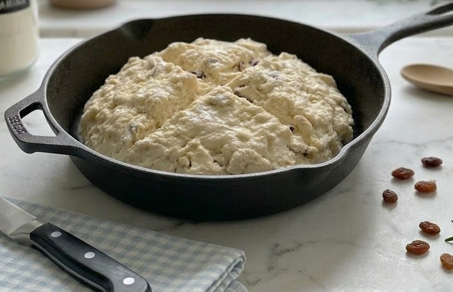 Préchauffez le four à 190°C. Beurrez généreusement la poêle en fonte ou le moule. Dans un grand saladier, mélangez au fouet la farine, le sucre, le sel et le bicarbonate. Ajoutez le beurre froid et travaillez-le rapidement du bout des doigts jusqu’à obtenir un mélange sablé. Incorporez les raisins secs.