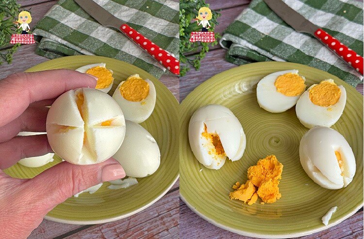 3 Sous l’eau (facultatif) : Éplucher les œufs sous un filet d’eau froide peut aider à faire glisser la coquille plus facilement.Faites une incision en croix sur le sommet des œufs comme sur la PHOTO. Écartez les quartiers avec délicatesse, pour éviter de les casser, et récupérez le jaune (voir photo). Rassemblez-les dans un bol et écrasez-les avec une fourchette.