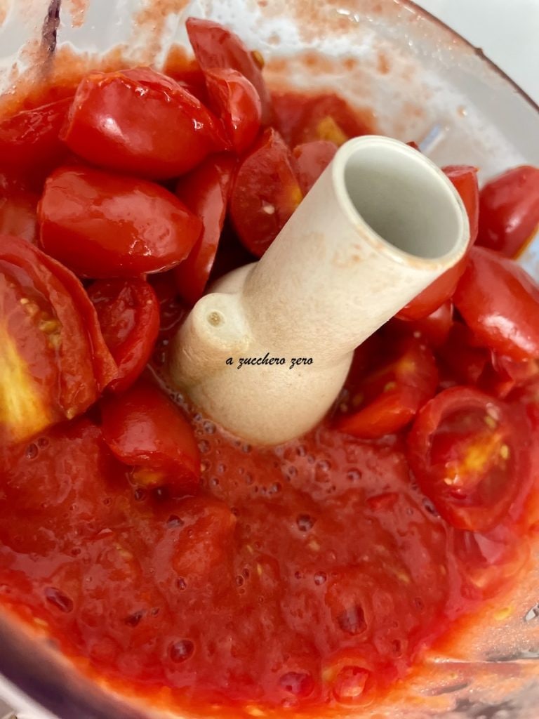 Les tomates cerises ne libèrent pas beaucoup d’eau, il suffit donc de quelques minutes : 5 ou un peu plus jusqu’à la consistance souhaitée.Lorsque les tomates sont tièdes :