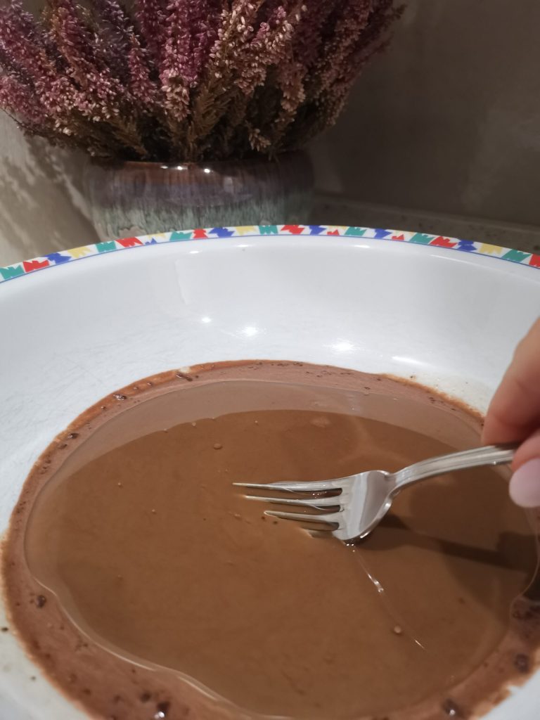 Ajoutez ensuite l’huile et le cacao amer et mélangez à nouveau.